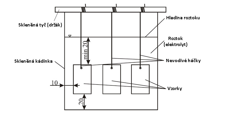 V průběhu testu jsou vzorky zavěšeny na nevodivých materiálech (např. skleněné háčky) tak, aby nedošlo ke vzájemnému ovlivnění korozních procesů. Rovněž musí být dodrženy vzdálenosti mezi vzorky, vzdálenost od dna a okrajů nádoby a hladina roztoku nesmí klesnout níže než 20 mm od vrchních okrajů vzorků (obr. 13). Do zkušební nádoby lze současně umístit pouze vzorky jednoho materiálu či jednoho povlaku naneseném na stejném podkladovém materiálu.