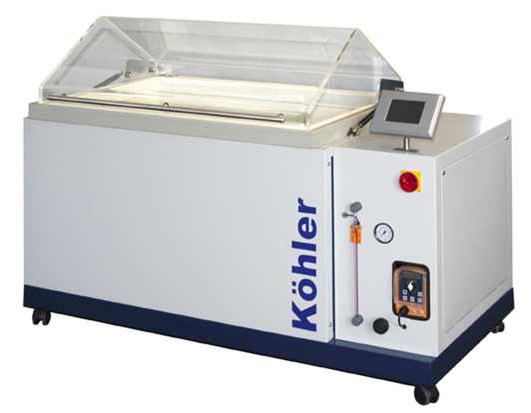 Zkušební zařízení není normalizováno, nesmí však být vyrobeno z korodujícího materiálu a nesmí docházet ke skapávání zkondenzované vody ze stěn na vzorky. Hlavními prvky komory jsou ohřívací systém a kontrola teploty, ventilátor a sběrná zařízení. Kondenzační komora od firmy Köehler je na obr. 16.
