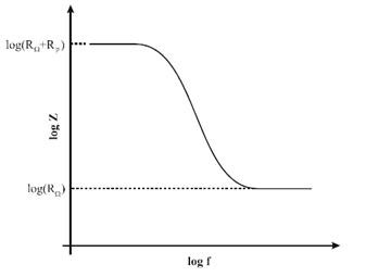 Výsledkem měření EIS je logaritmická frekvenční charakteristika korozního systému (log Z – log f). Na obr. 18 je znázorněna logaritmická frekvenční charakteristika obvodu, který je ekvivalentní jednoduchému koroznímu systému. RΩ značí odpor elektrolytu a Rp polarizační odpor.