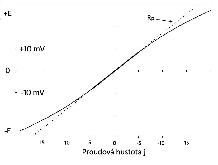 Metoda polarizačního odporu je založena na předpokladu, že střední část výsledné polarizační křivky korozního systému je v nejbližším okolí korozního potenciálu (η = E – Er = ± 10 mV) lineární a protíná pod určitým úhlem osu nulové proudové hustoty (obr. 20). Směrnice této přímky je charakteristická pro daný korozní systém.